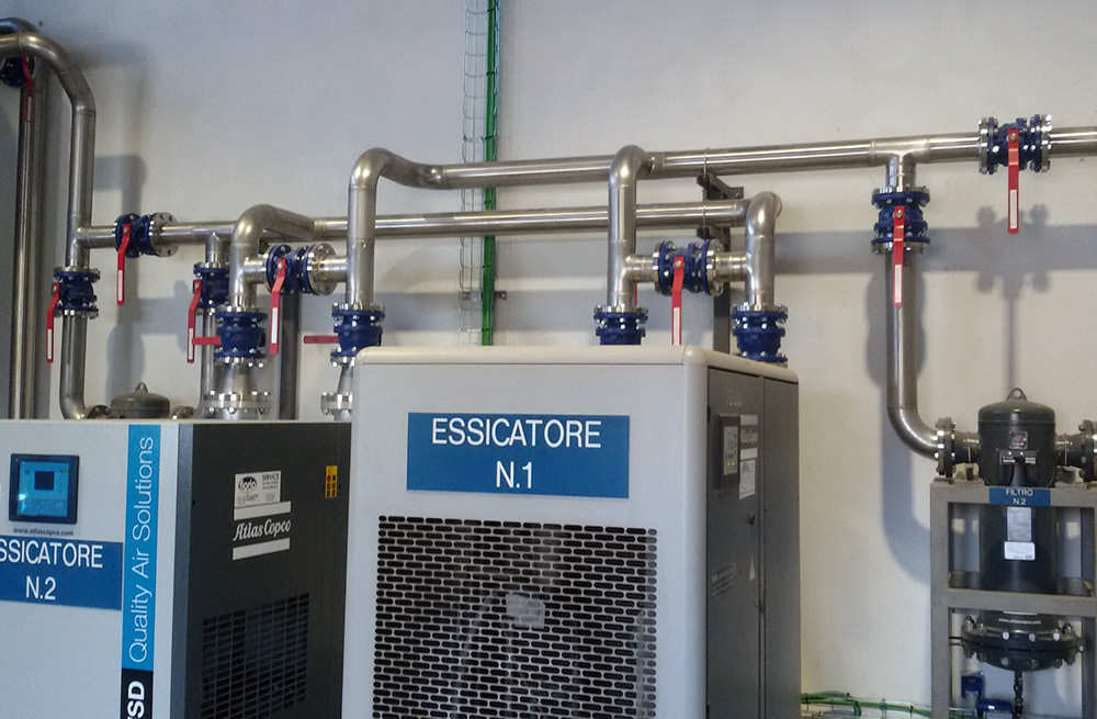 Impianti di distribuzione aria compressa realizzati in acciaio inox, zincati o con profili in alluminio, completi di serbatoi accumulo, degli accessori e delle sicurezze necessari.
